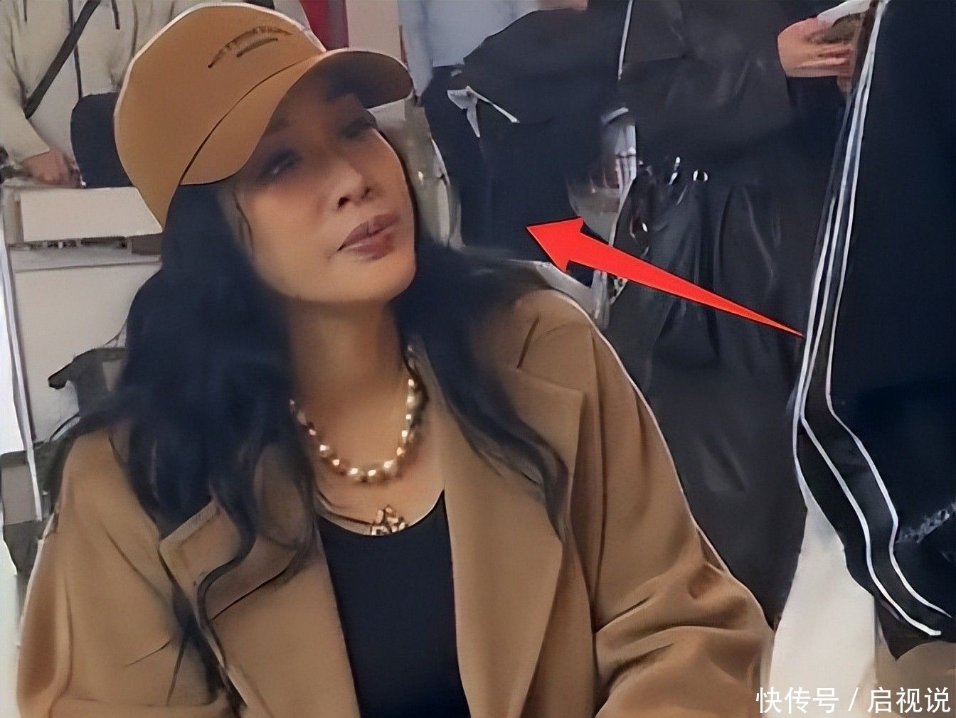 10. 视频里,钟丽缇头戴一顶深棕色帆布材质的鸭舌帽,帽檐压得很低,几乎遮住上半张脸,仅露出鼻梁与嘴唇。